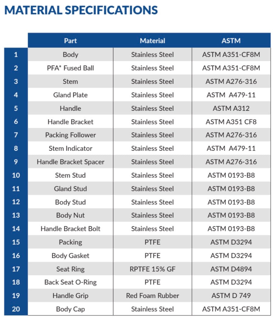 Valves shall be full port and of the floating-ball design, providing bidirectional tight shutoff in accordance with MSS SP-72. Valves shall be rated at 150 PSI WSP / 300 PSI WOG. The body shall be cast 316 stainless steel (ASTM A351-CF8M) with ANSI Class 150 raised-face flanges. The ball shall be PFA-fused solid stainless steel*, paired with a 316 stainless steel blowout-proof stem.