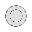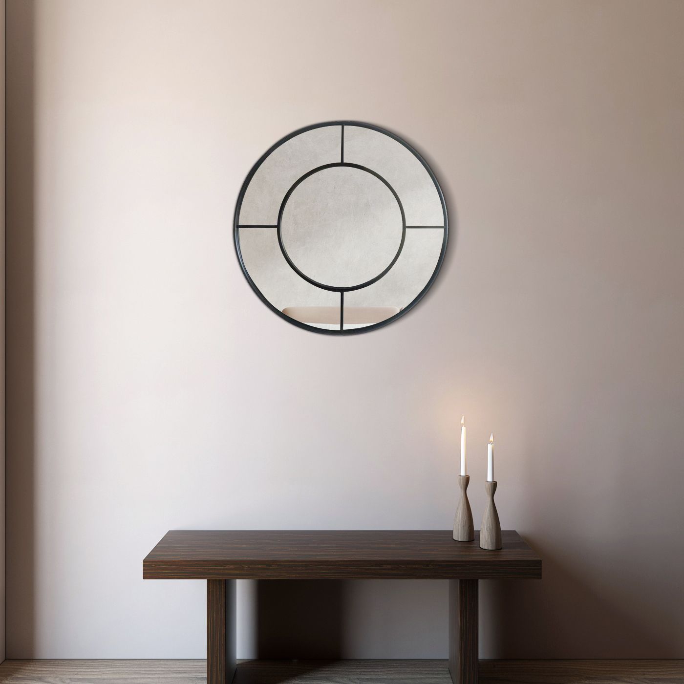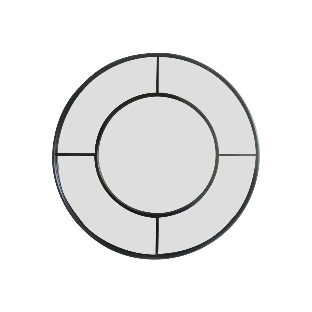 This round mirror has an elegant and decorative metal window frame that looks