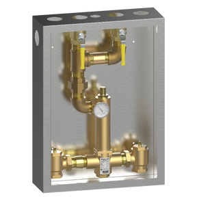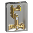 Lawler's 86380 Cabinet with 805 High-Low Thermostatic Mixing Valve provides tempered water over a wide range of flows in a single valve unit. Ideally suited for institutional and commercial applications such as group showers, schools, hotels, hospitals, prisons, and nursing homes. The 805 will provide from 5 to 200 gpm @ 45 psi (1/2 gpm when properly installed in a recirculated system). This valve provides three-way protection from scalding upon: 1) failure of the thermostat, 2) shut-off of hot water, or 3) shut-off of cold water. This one piece, single body valve contains a liquid filled thermostat, a stainless steel piston and liner, and is ASSE 1017 and CSA B125.3 approved. This single valve is easier to install, easier to maintain and more cost efficient than multi-valve systems on the market.