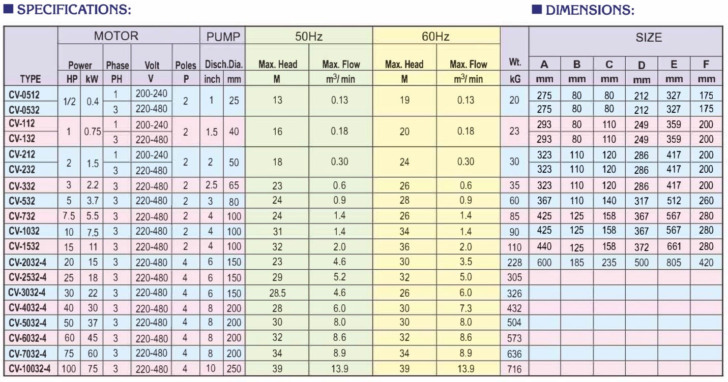 | HP | PH | V | Material | Disch in. | Head FT | Flow gal/min |