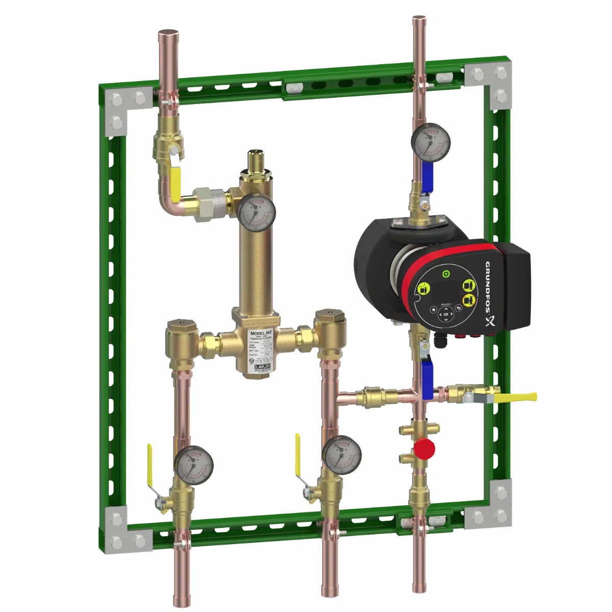 Lawler’s Mini Recirculation System is a turnkey unit that includes Lawler’s patented single valve high-low technology as well as integrated smart pump technology that helps improve balancing of the recirculation loop. The system also includes thermometers, ball valves, mounting strut and a test connection.