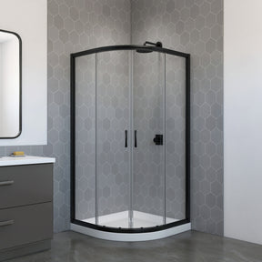 Tempered glass panels and an easy-to-clean shower pan form the angular design of this neo-round shower. Black details add a modern touch to the clear glass shower door that opens to reveal a welcoming shower space against every wall. The kit also includes a shower drain for fast removal of water and suds.