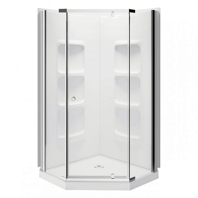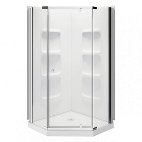 Tempered glass panels and an easy-to-clean shower pan form the angular design of the neo-angled shower that fits perfectly in the corner of an en suite or detached bathroom. Optional recessed shelves offer integrated organization for storing soap, shampoo and shower toiletries Within the acrylic shower walls.