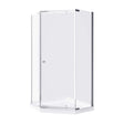 - Clear tempered glass panels highlight the white acrylic shower wall within