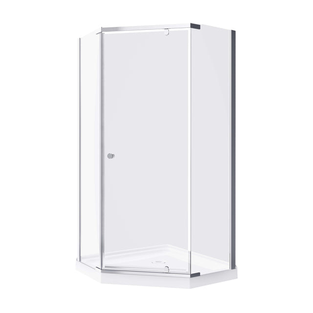 Tempered glass panels and an easy-to-clean shower pan form the angular design of the neo-angled shower that fits perfectly in the corner of a suite or detached bathroom.