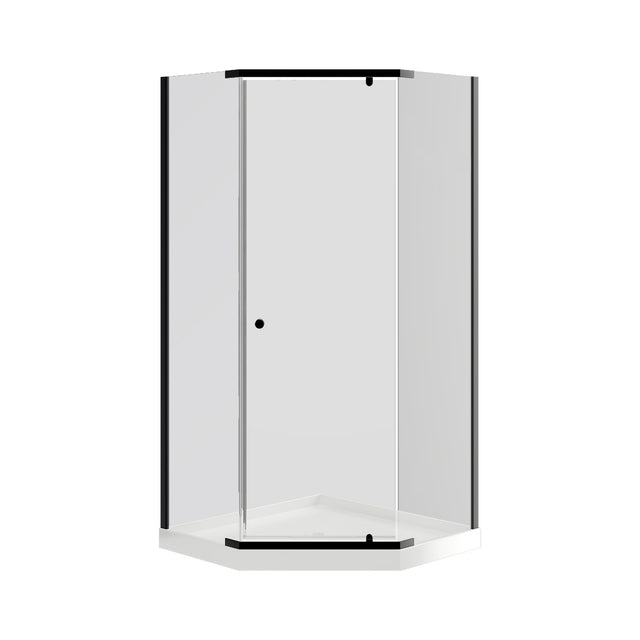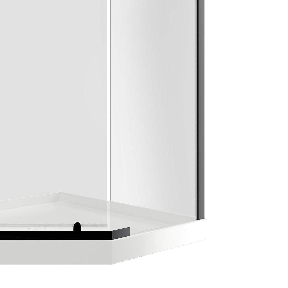 - Clear tempered glass panels highlight the white acrylic shower wall within