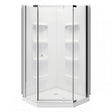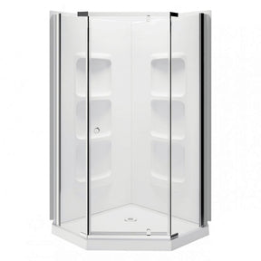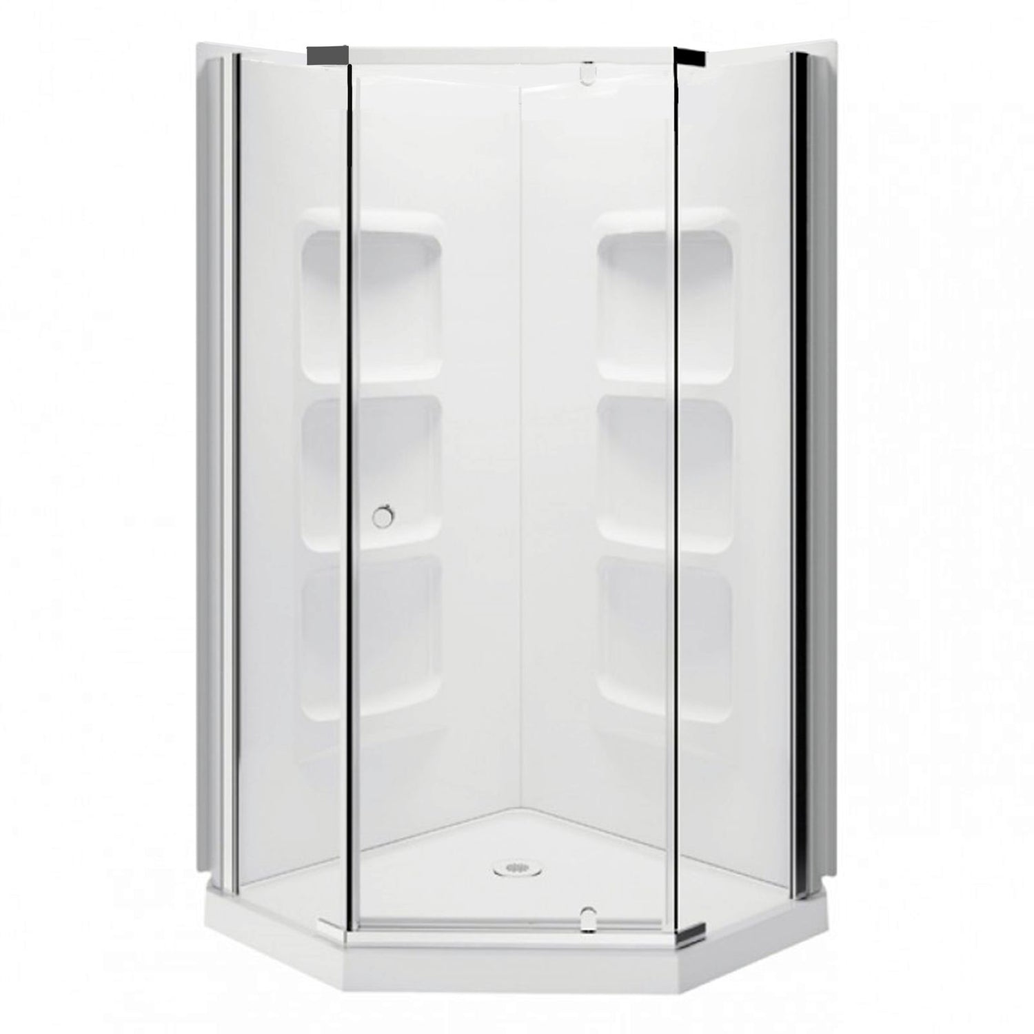Tempered glass panels and an easy-to-clean shower pan form the angular design of the neo-angled shower that fits perfectly in the corner of a suite or detached bathroom. Optional recessed shelves offer integrated organization for storing soap, shampoo and shower toiletries within the acrylic shower walls.