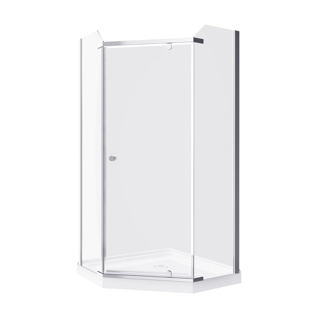 Tempered glass panels and an easy-to-clean shower pan form the angular design of the neo-angled shower that fits perfectly in the corner of a suite or detached bathroom.