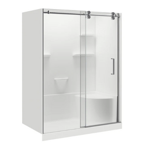 The Clayton Shower Kit includes the acrylic base with integrated seat, acrylic shower walls with shelving and grab bar, and an 8 mm tempered glass sliding door with decorative rollers—providing a coordinated and functional all-in-one solution.