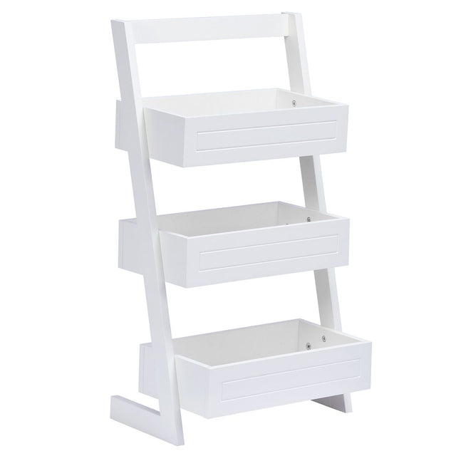 Add a touch of style to your bathroom or any room with this 3-teir ladder shelf organizer. Perfect for holding toiletries in smaller spaces. Sized to just 16 x 11 x 28”, this shelf will maximize your space with it’s 3 shelves. Fits well in corners any anywhere in a room. A smooth white coating, tasteful design, and long lasting, durable MDF wood will complement many spaces.