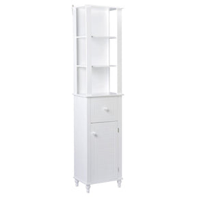 This storage cabinet with its slim silhouette stands tall and proud while providing the extra storage space needed in your bathroom or any space. The 3 open shelves are perfect for storing candles or rolled up towels, while the closed pull-out drawer and door offer out of sight storage for your toiletries and bathroom items. Sized to 16 x 12 x 72” and made to maximize your space with style. A smooth white coating with solid wood carved legs and a durable MDF wood design will complement your space for a long time.