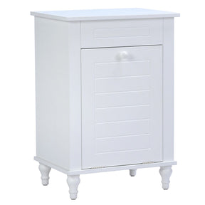 Surpassing the expectations of a laundry cabinet, this smart design slides open with a pull of the white knob and provides ample space for your laundry items. Comes with a spacy counter top for even more space. Measuring 16 x 12 x 23 ", this laundry cabinet fits nicely into your bathroom. A smooth white coating with solid wood carved legs and a durable MDF wood design will complement your space for a long time.
