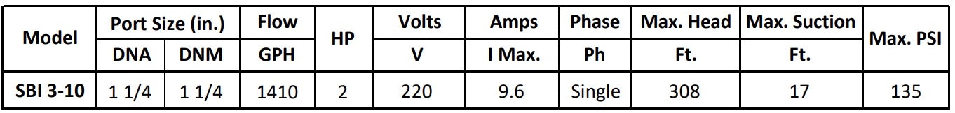 The SBI 3-10 (1 PH) version runs on 230/240V, 60Hz, ideal for homes, farms, and facilities with standard single-phase supply.