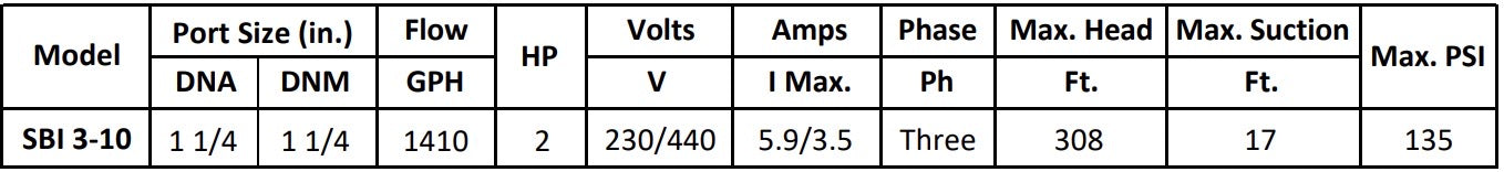 The SBI 3-10 (3 PH) model operates on 230/440V, 60Hz, designed for applications requiring continuous-duty and higher power performance.