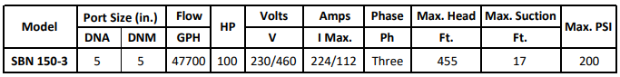This model is equipped with a 75 kW, 3-phase NEMA motor rated for 460V, 60Hz operation, providing reliable and energy-efficient performance. ANSI 150 flange connections allow for easy installation and secure integration into existing piping systems.