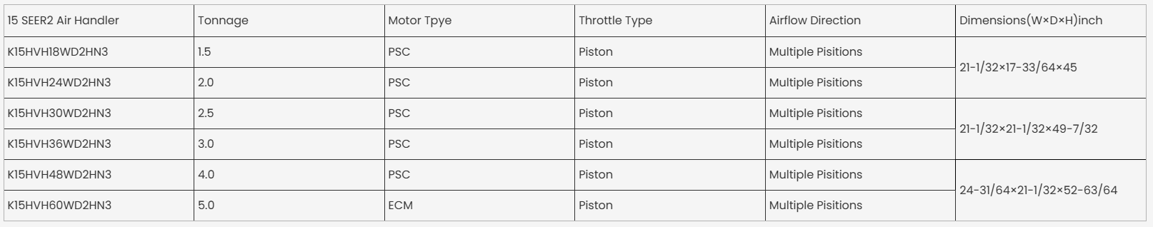 Fan Motor Type: PSC Motor (1.5–4T) / ECM Motor (5T)